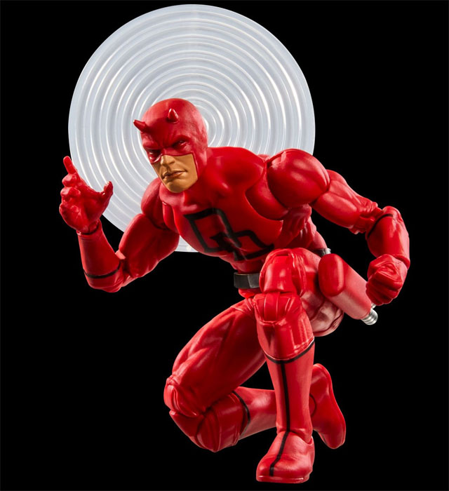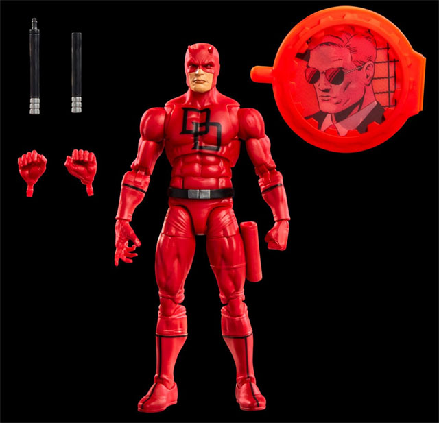Marvel Legends Secret Wars Daredevil gives ol’ hornhead a new super-articulated body, with plug-in sensory effects piece, alt hands, lenticular shield and two batons that can attach into a billy club, have the attachment points removed, and can fit into the holster on his leg.