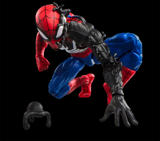 In theory, this sounds hella cool. However, the execution here really leaves a lot to be desired. Rather than going with a complicated paint scheme depicting the symbiote actually growing and gradually overtaking the red and blue costume, we get a black costume upper chest and left arm that abruptly switch to the classic costume for the rest of the figure. This looks really jarring and bad to me (especially how the abs are just the normal costume).